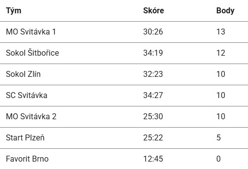 Na třetím až pátém místě byl počet bodů dokonce shodný, když jich každý z týmů vybojoval 10 za tři výhry a jednu remízu. O konečném pořadí tak muselo rozhodnout až skóre. To promluvilo následovně, body za třetí místo získal Sokol Zlín ( Radek Adam / Tomáš Horák ) , za čtvrté místo SC Svitávka ( Jiří Hrdlička st. / Jan Kripner ) a za místo páté nováček v soutěži , tým MO Svitávka 2 ( Michal Musil / David Petr ).